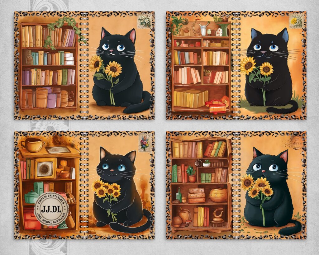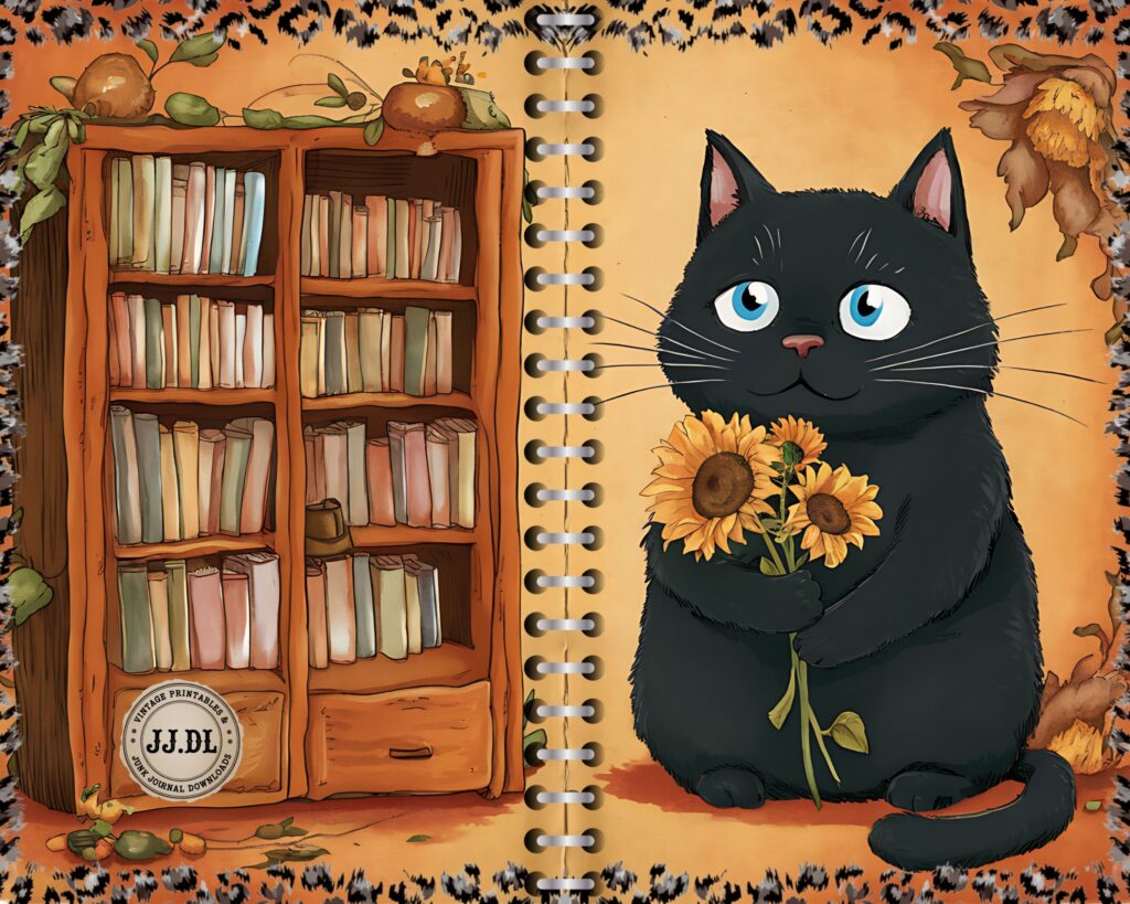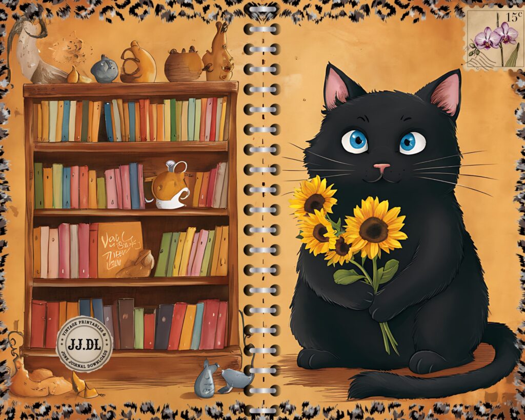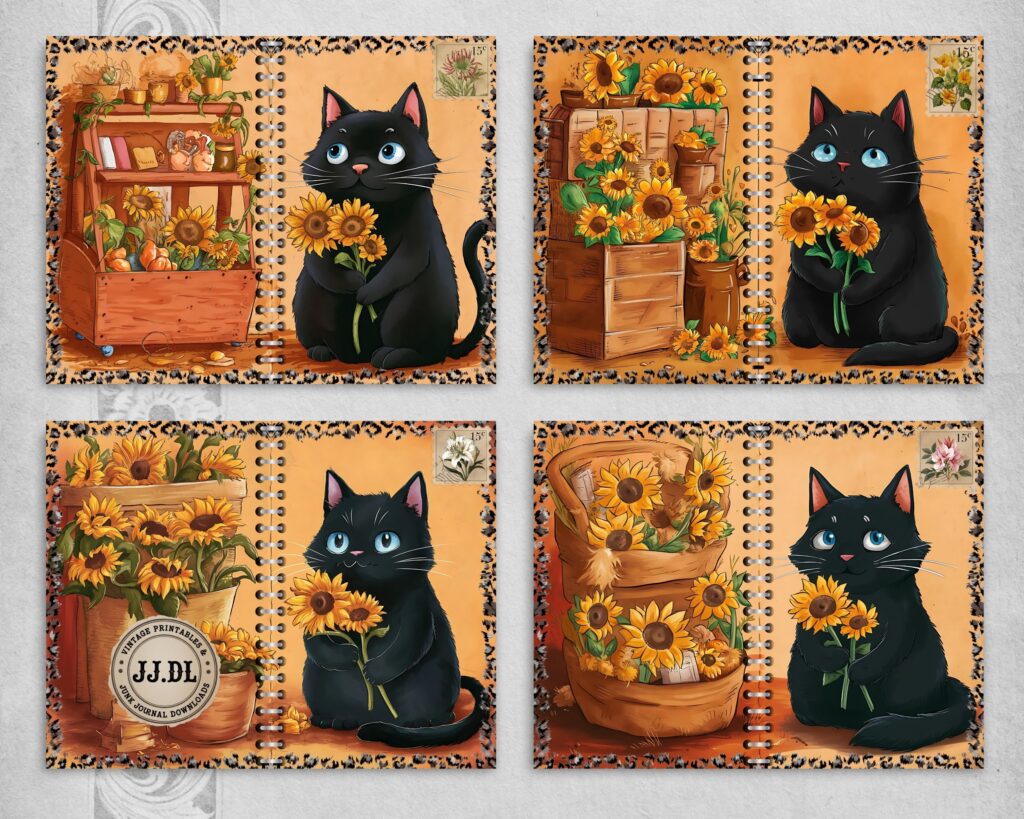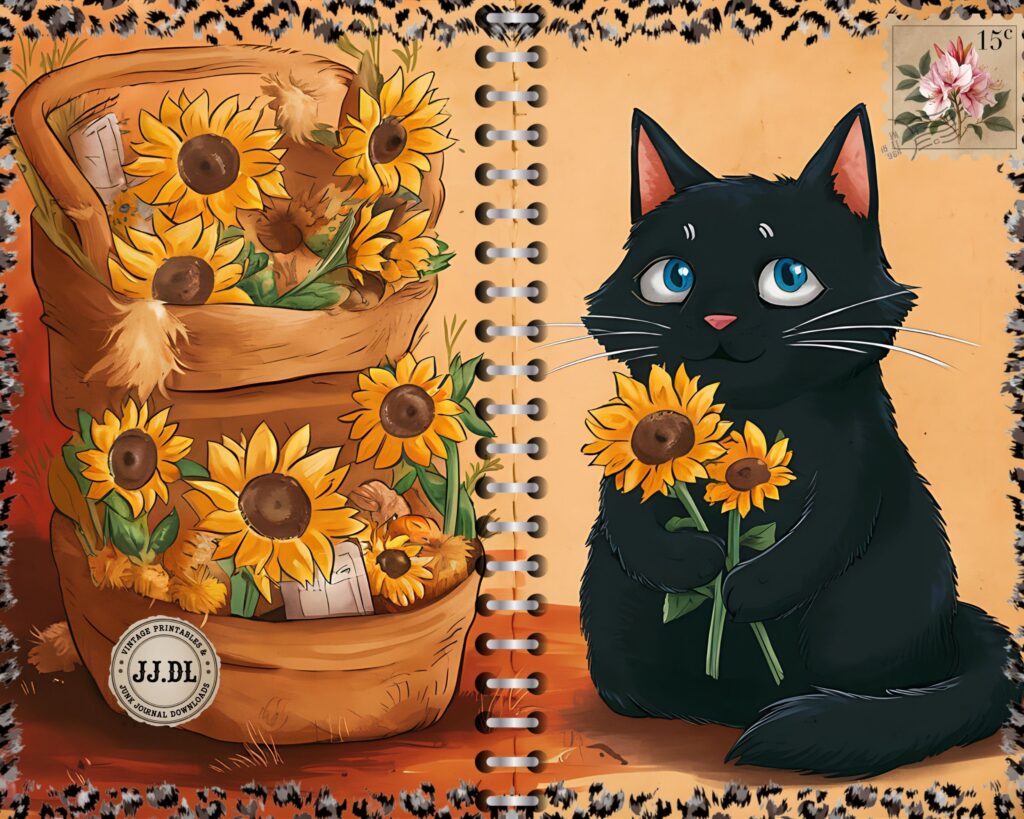 Black Cat with Sunflowers Printable, Ghibli-Inspired Junk Journal Page, Leopard Frame, Vintage Ephemera, Scrapbook Kit