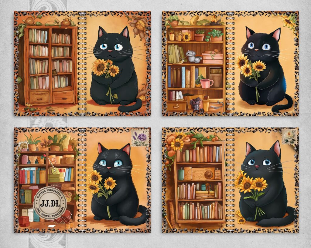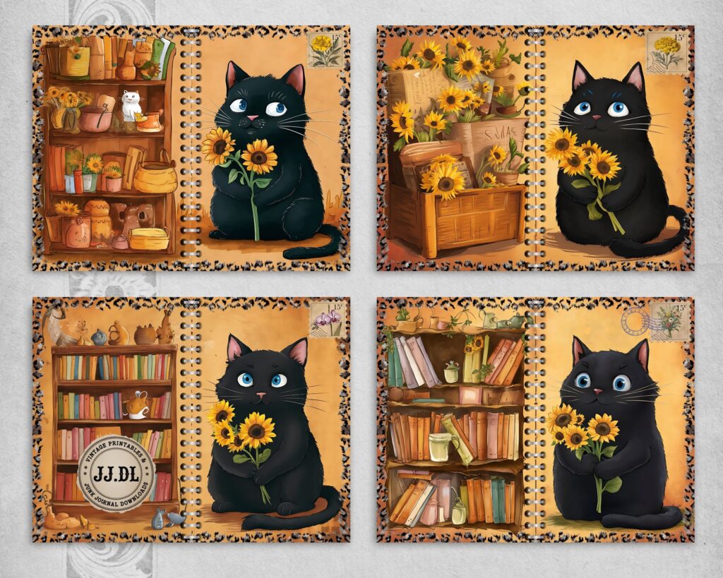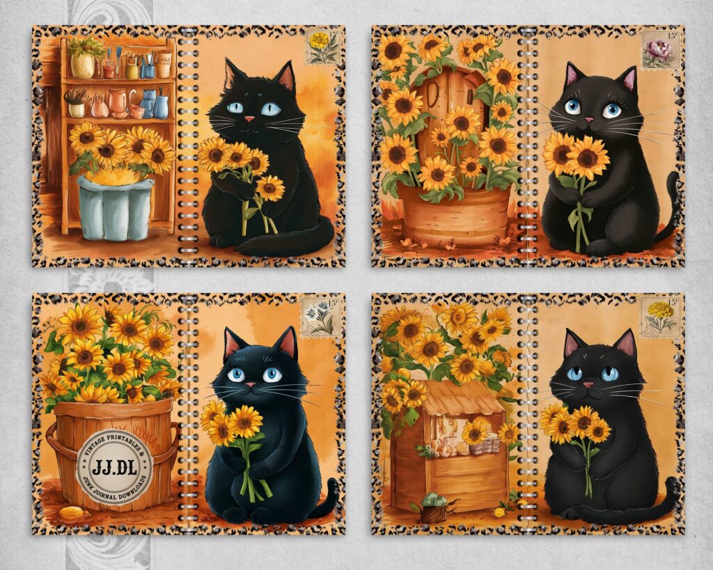Bring a touch of cozy whimsy to your junk journal with this set of 20 Black Cat with Sunflowers Printables. Each page features a Ghibli-inspired watercolor illustration of a black cat with bright blue eyes, gently holding a bouquet of sunflowers. The cat is positioned on the right side of the page, leaving the left side open for journaling or creative collage work.