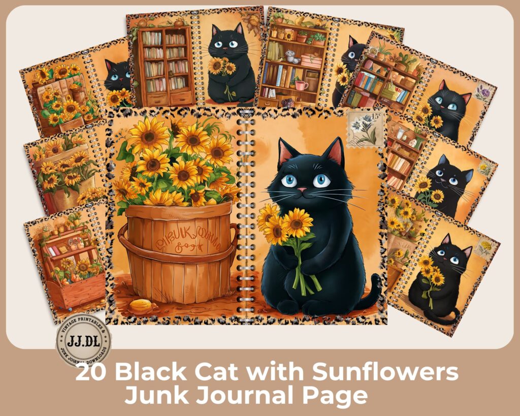Bring a touch of cozy whimsy to your junk journal with this set of 20 Black Cat with Sunflowers Printables. Each page features a Ghibli-inspired watercolor illustration of a black cat with bright blue eyes, gently holding a bouquet of sunflowers. The cat is positioned on the right side of the page, leaving the left side open for journaling or creative collage work.