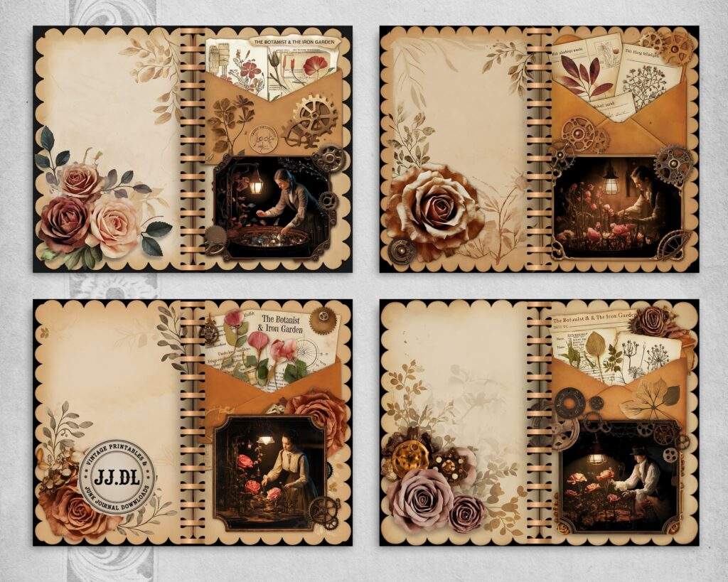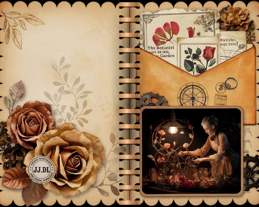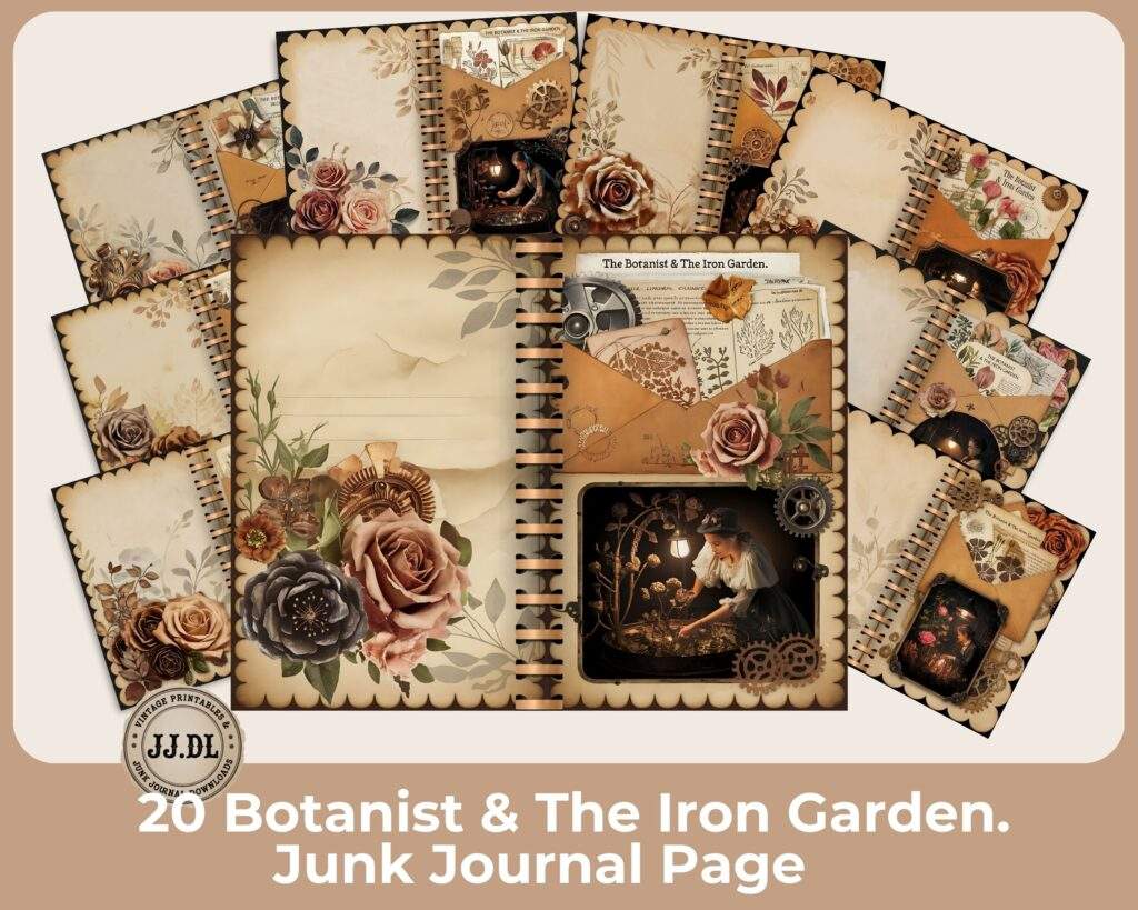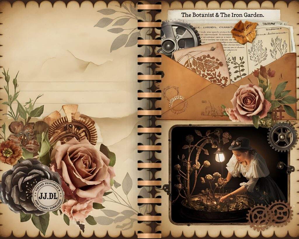 Step into a world where nature meets machinery with “The Botanist & The Iron Garden”, a 20-page romantic steampunk junk journal kit that blends botanical beauty with vintage industrial charm.
