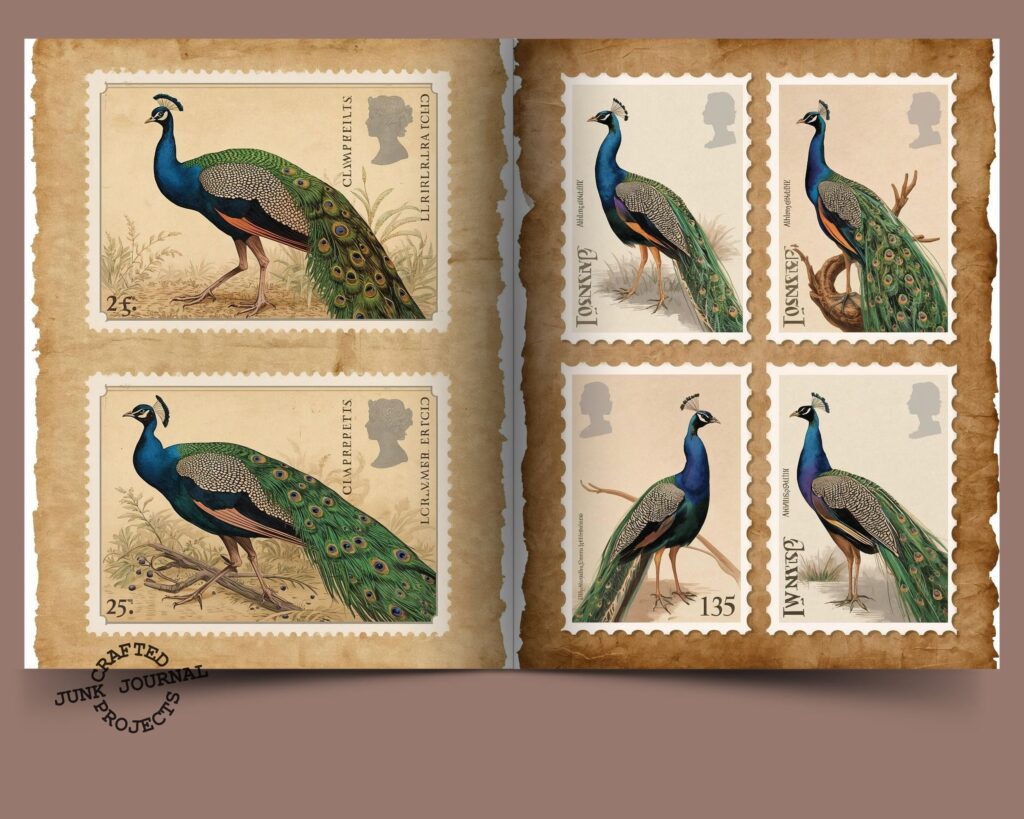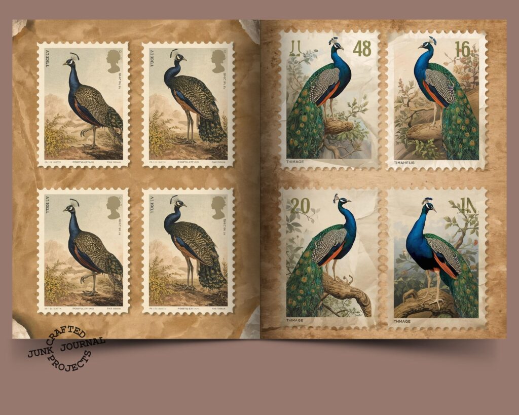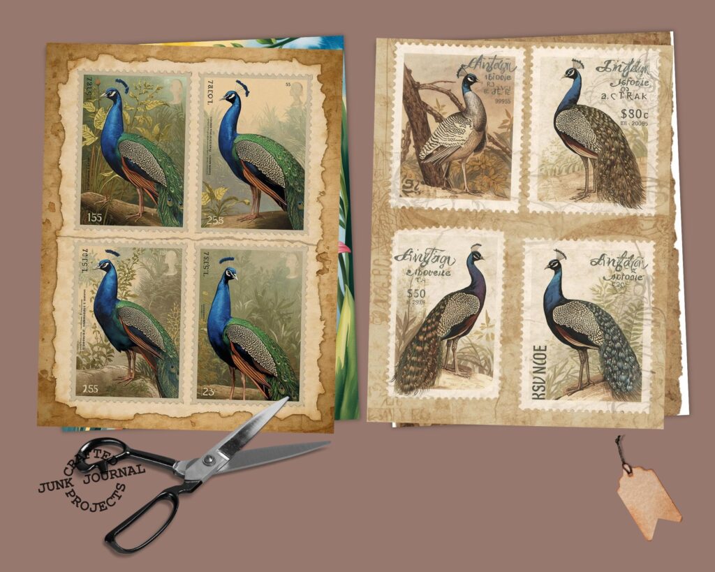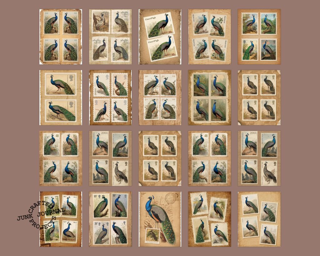 Vintage Peacock Postage Stamps Ephemera Printable, Sepia Paper Background, Junk Journal Supplies, Scrapbook Kit