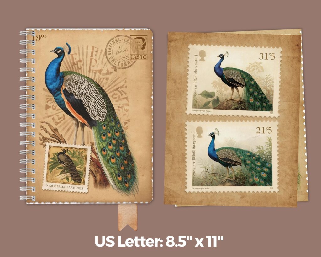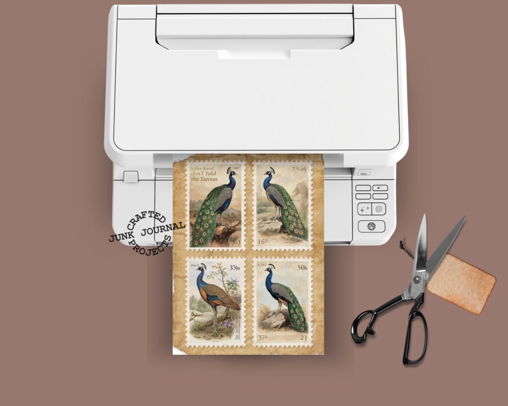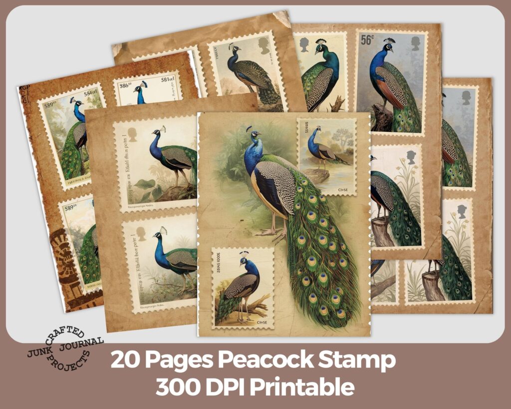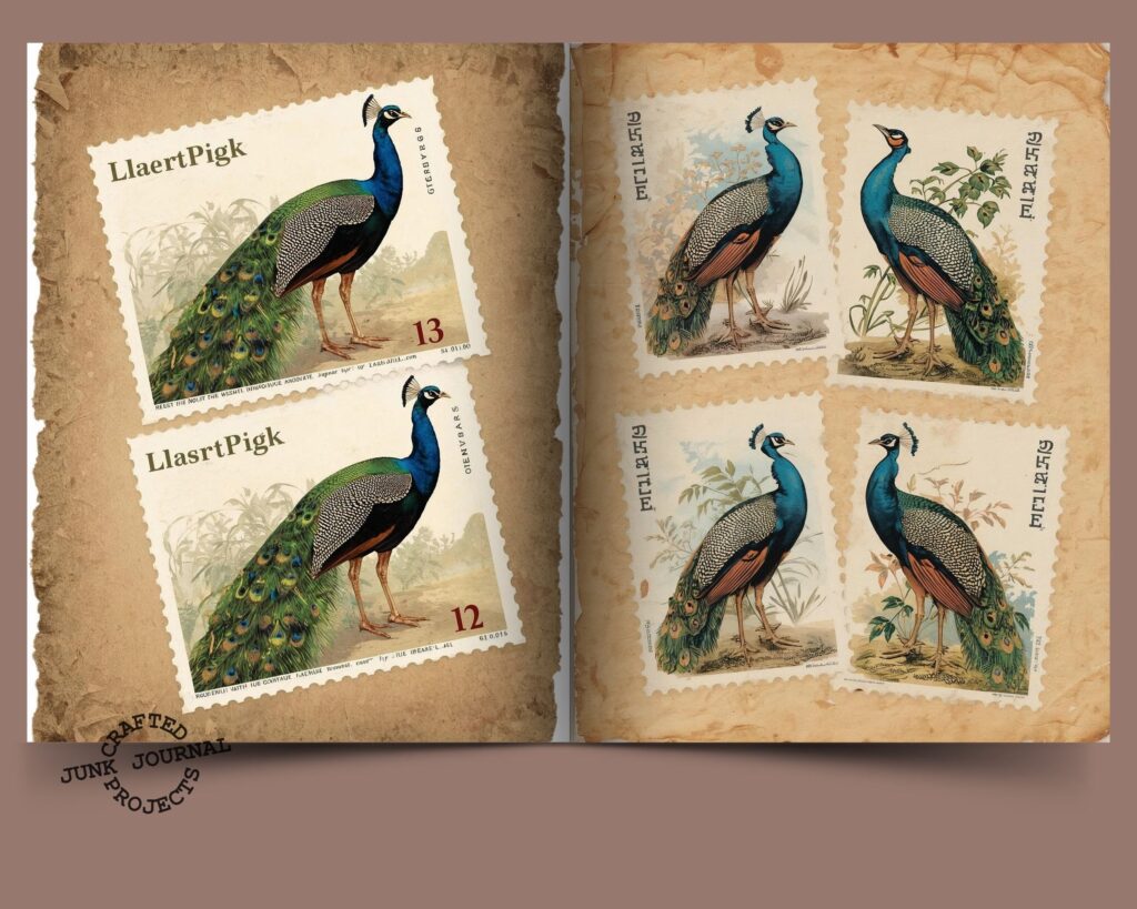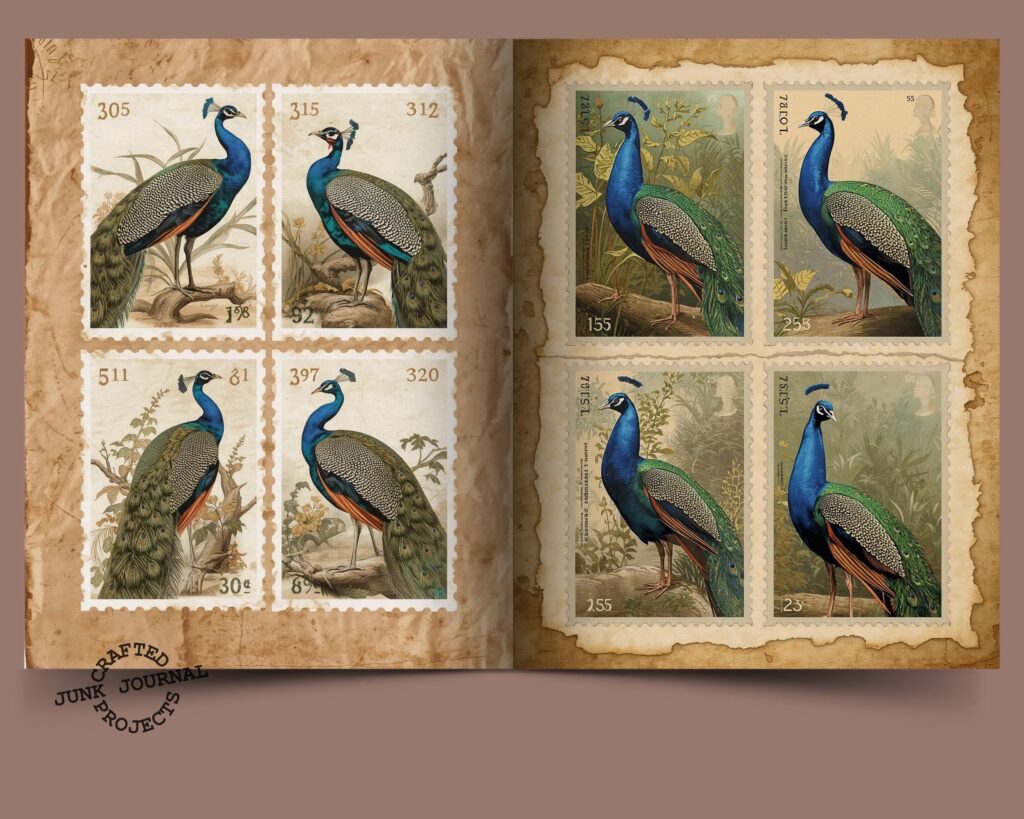 Vintage Peacock Postage Stamps Ephemera Printable, Sepia Paper Background, Junk Journal Supplies, Scrapbook Kit