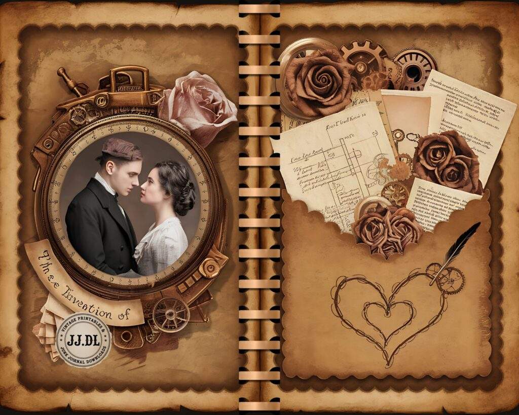Step into a world where romance meets invention with “The Invention of Love & Time”, a 20-page printable Victorian steampunk junk journal kit designed for dreamers, artists, and collectors of old-world beauty.