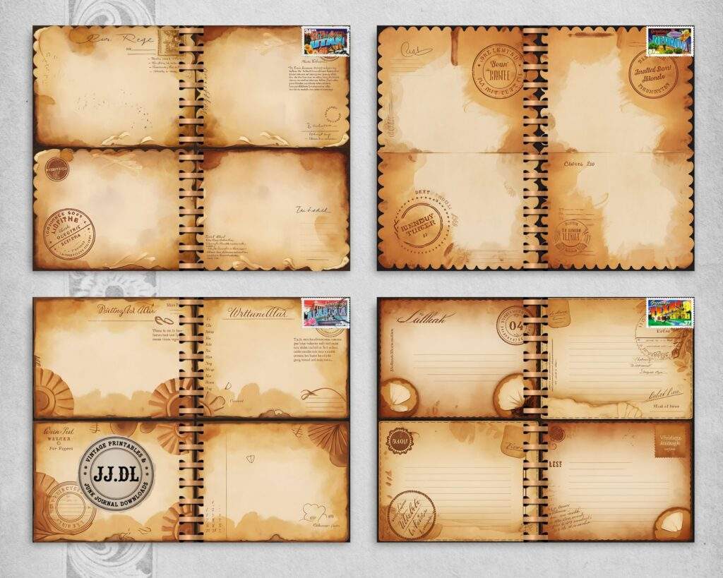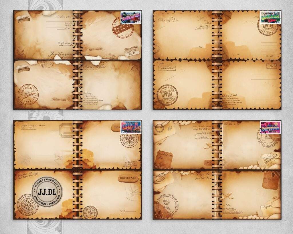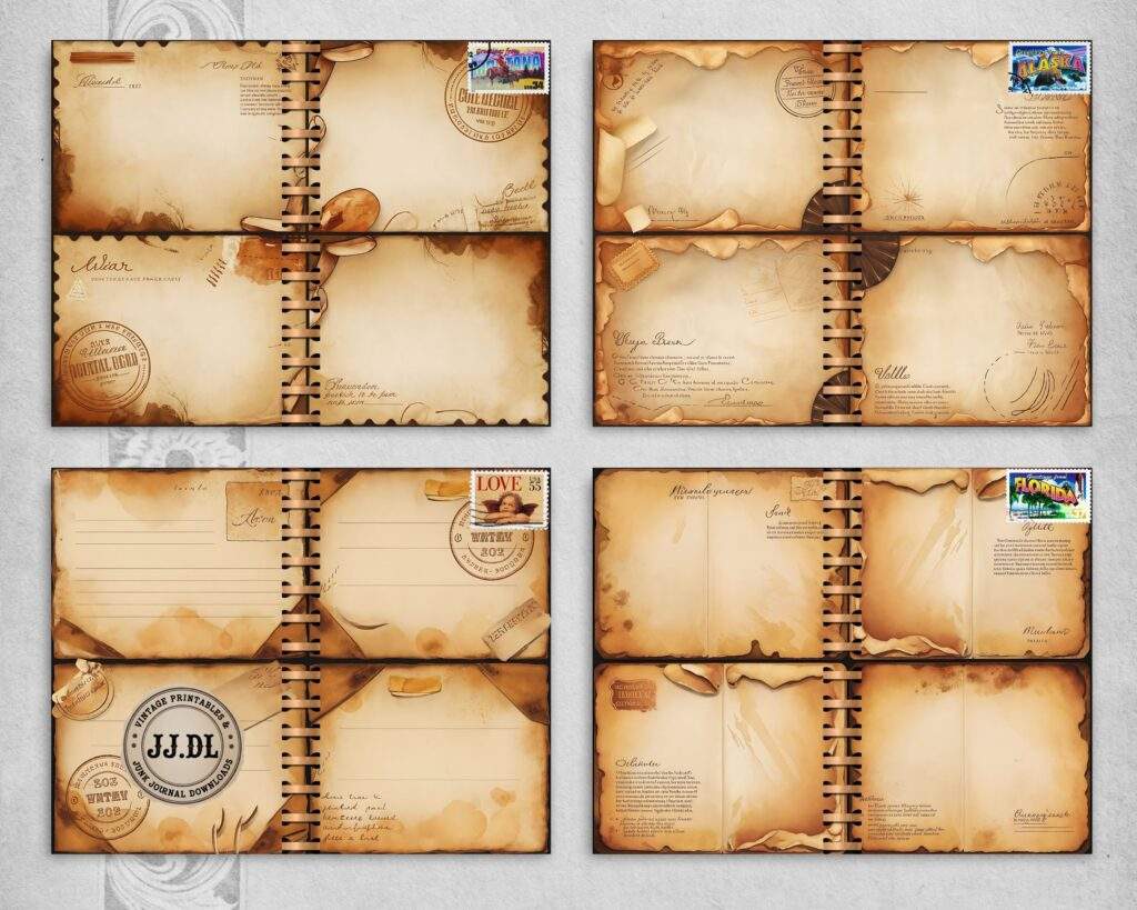 Each page is fully blank for journaling, designed with rich tea-stained parchment, scalloped edges, and soft ink distressing in warm beige and golden brown hues. Subtle postal marks, natural paper fibers, and gentle folds lend each sheet the tactile realism of genuine antique stationery.