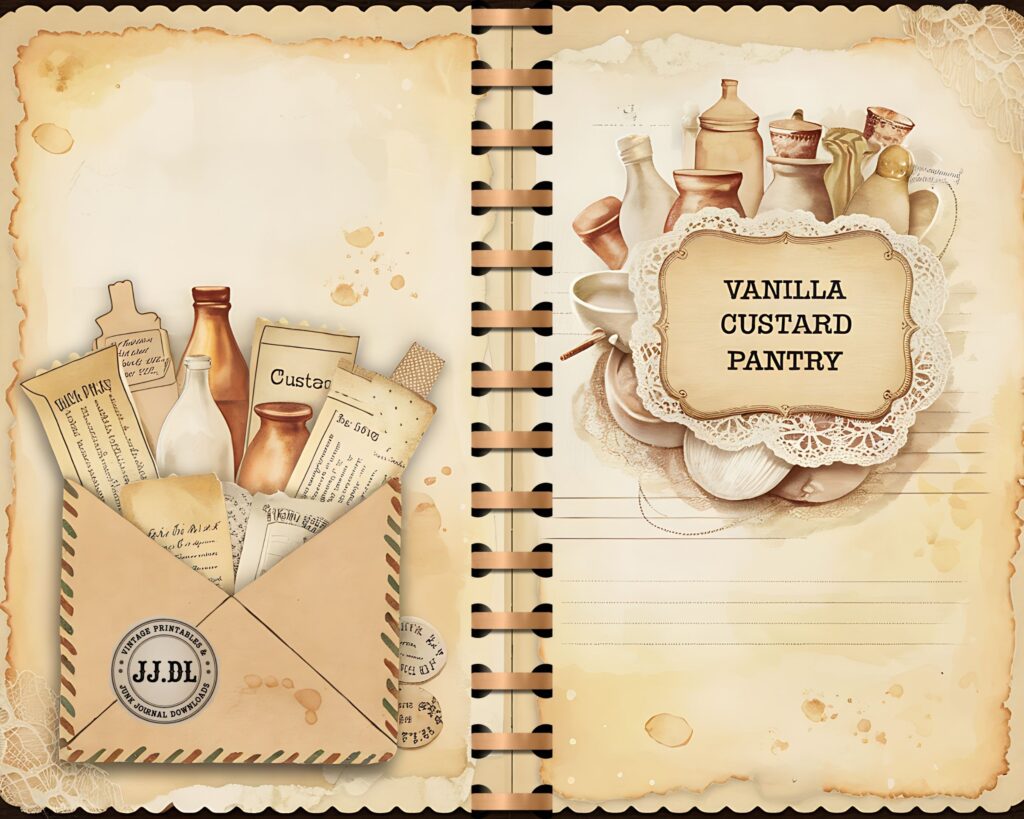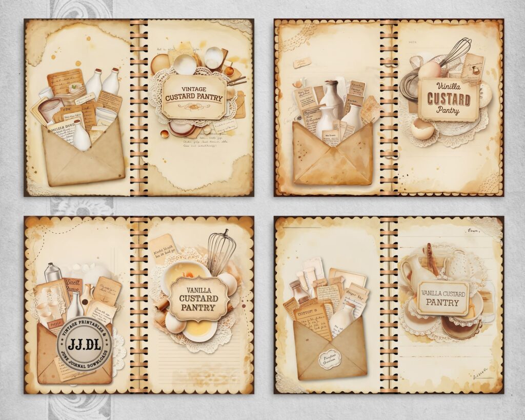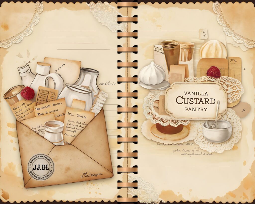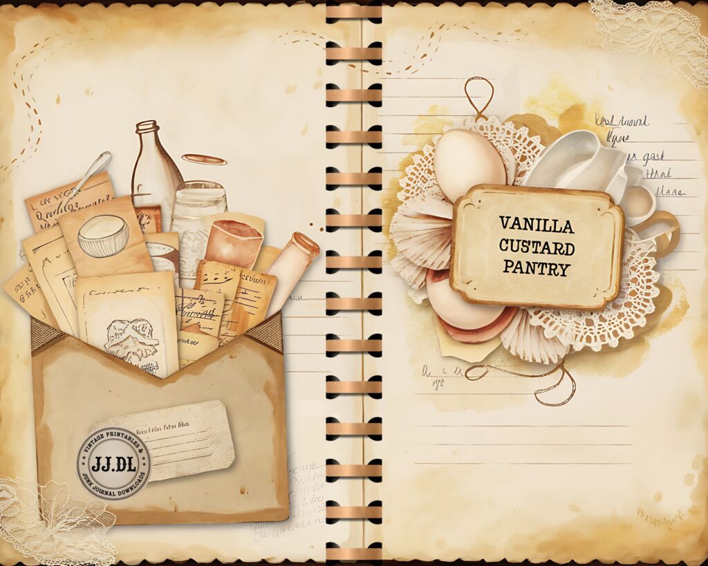 Vanilla Custard Pantry Junk Journal Kit – 20 Printable Dessert Recipe Pages | Vintage Kitchen Collage, Scrapbook Supplies