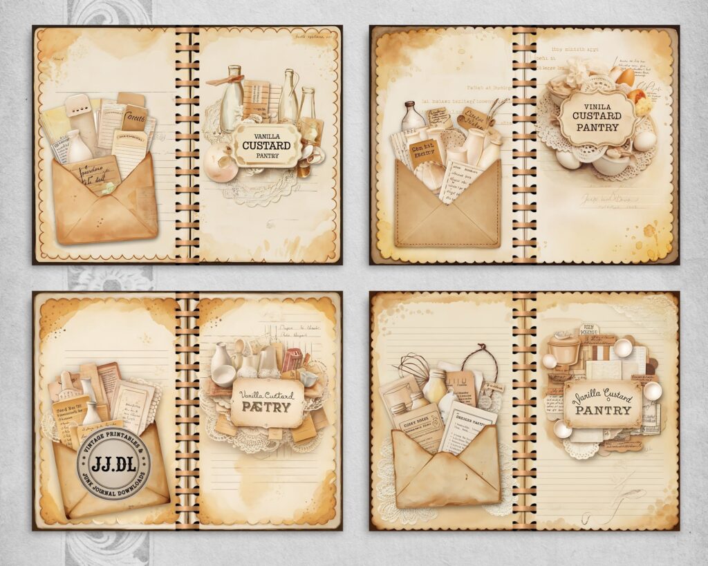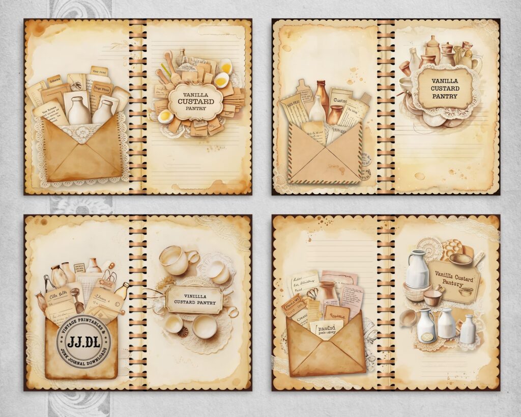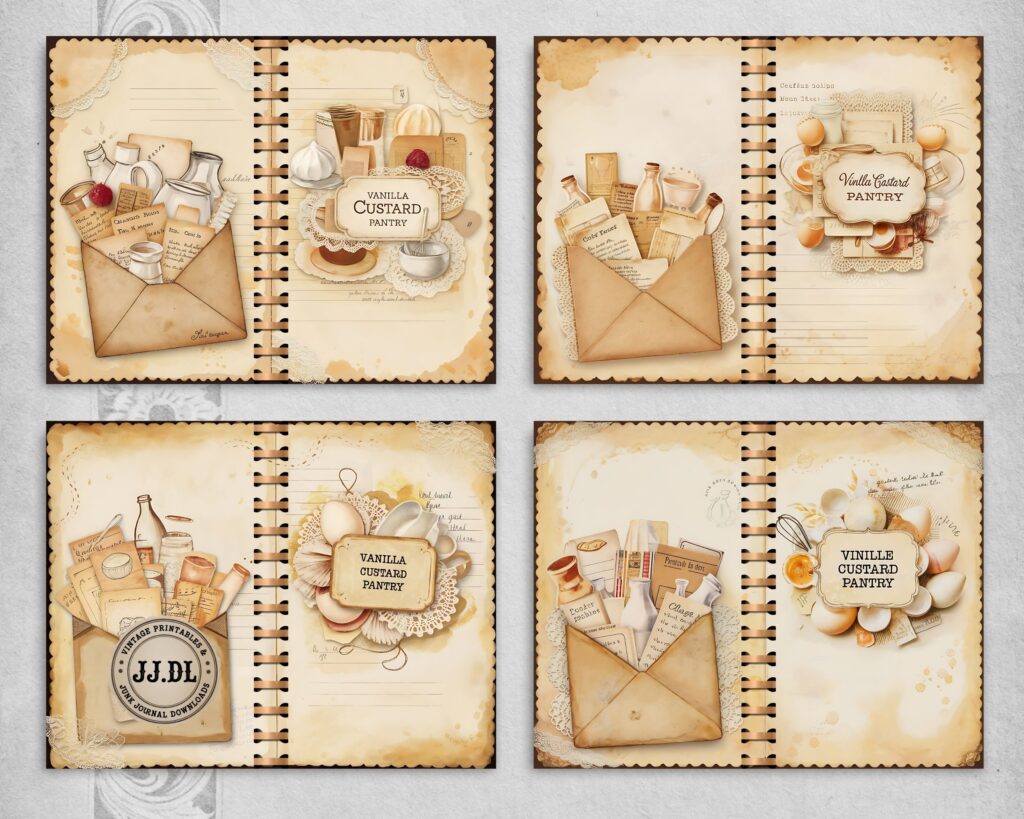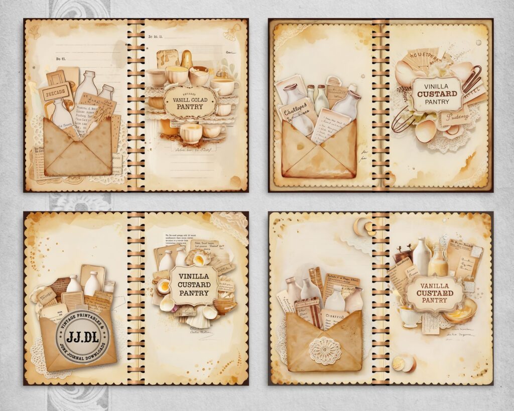 Vanilla Custard Pantry Junk Journal Kit – 20 Printable Dessert Recipe Pages | Vintage Kitchen Collage, Scrapbook Supplies