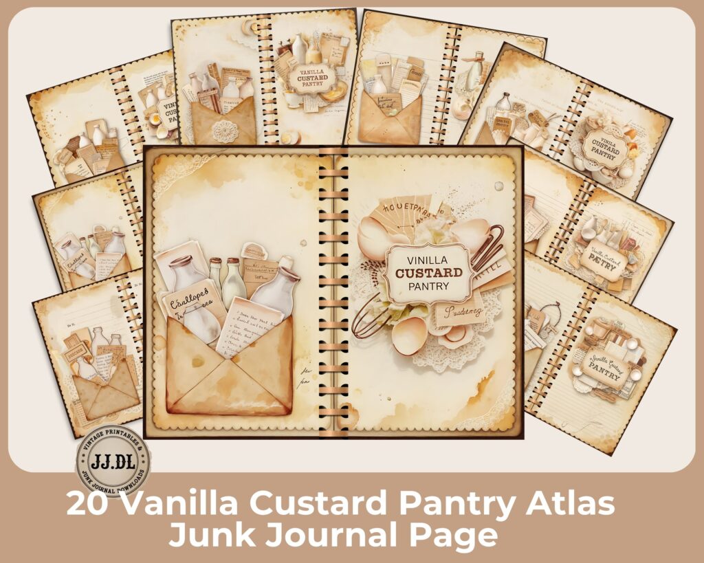 Vanilla Custard Pantry Junk Journal Kit – 20 Printable Dessert Recipe Pages | Vintage Kitchen Collage, Scrapbook Supplies