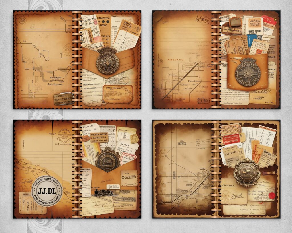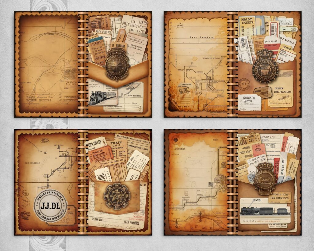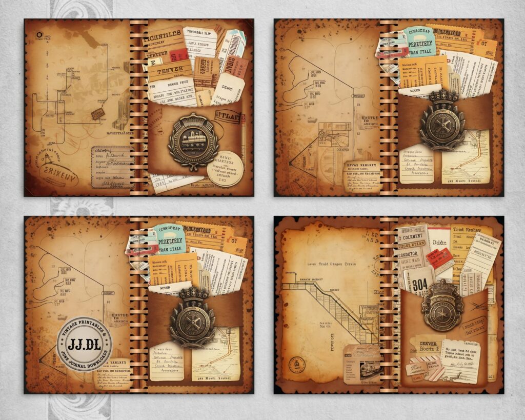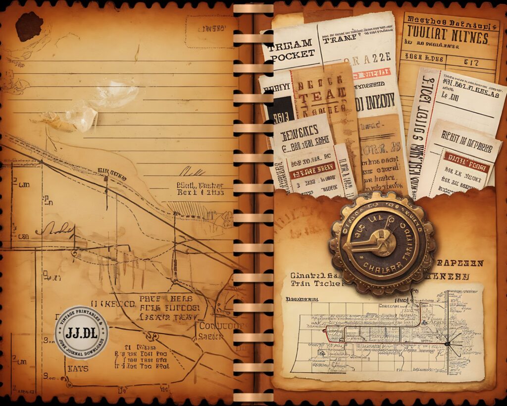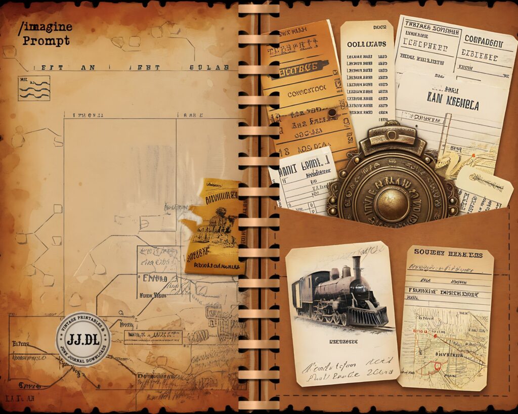Step aboard a bygone era with the Steam Railway Vintage Junk Journal Kit, a 20-page printable collection inspired by the golden age of locomotives and cross-country exploration. Designed on richly tea-stained parchment with scalloped edges, each page captures the timeless romance of steam travel, filled with nostalgic detail and layered texture.