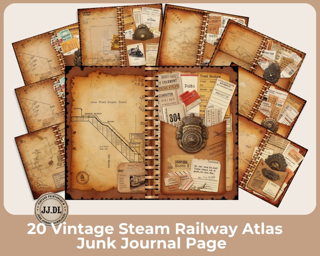 Steam Railway Vintage Junk Journal Kit – 20 Printable Train Ephemera Pages & Antique Travel Collage Papers, Scrapbook Supplies