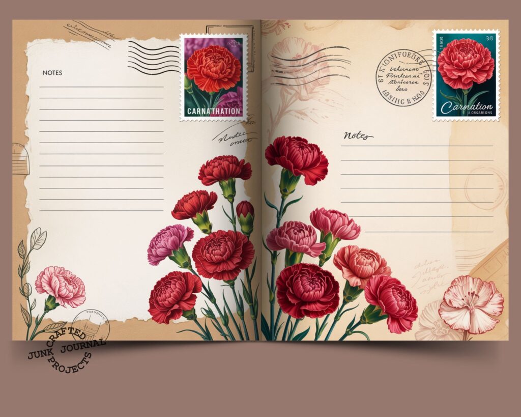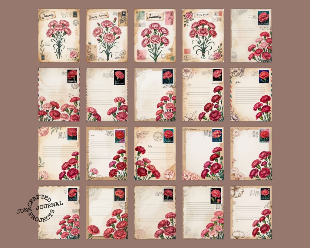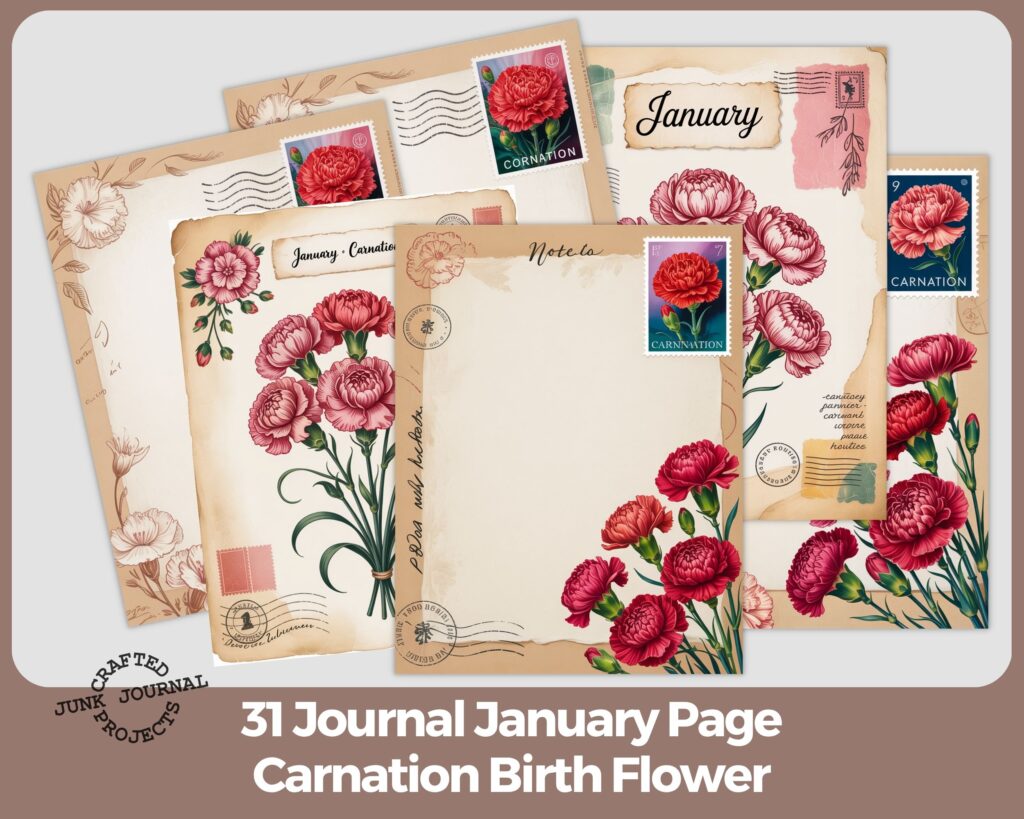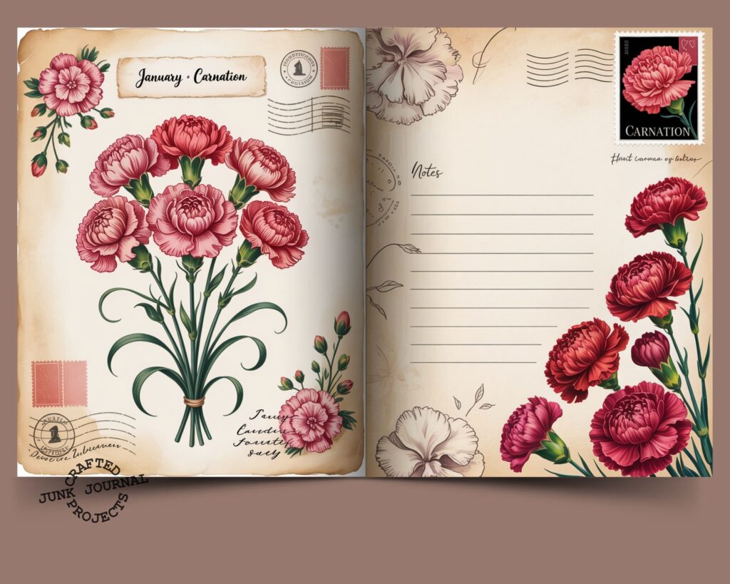 January Carnation Birth Flower Journal Pages, Menstrual & Daily Notes Printable, Junk Journal Supplies, Vintage Scrapbook Kit