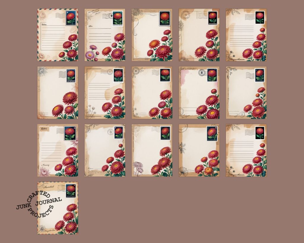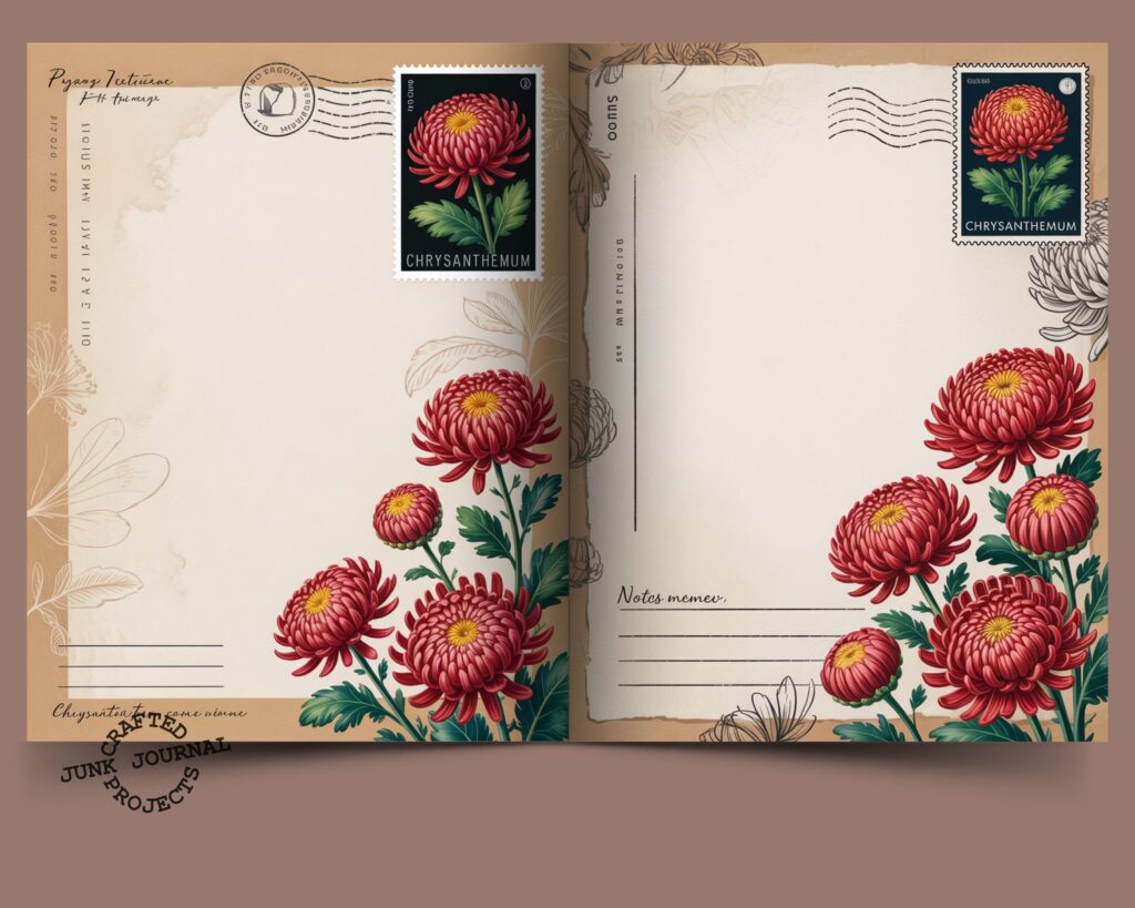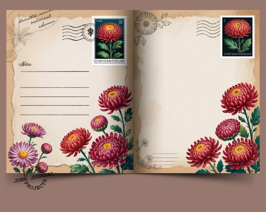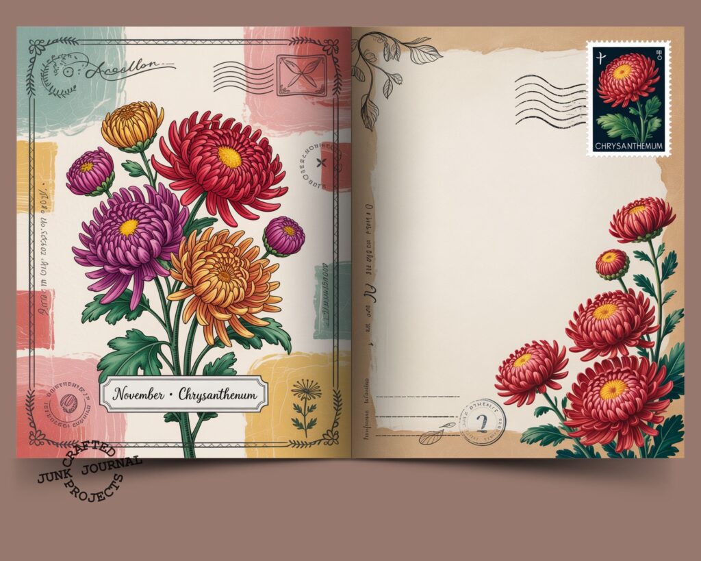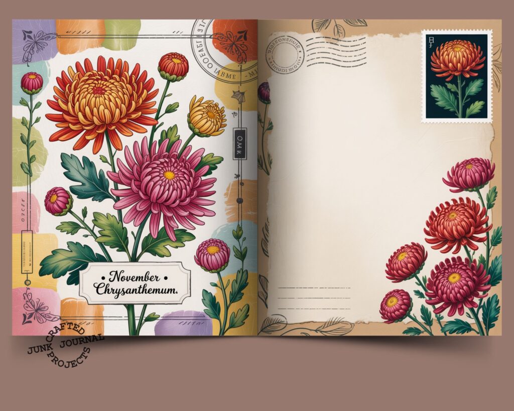 Celebrate the calm beauty of late autumn with this November Chrysanthemum Birth Flower Journal Kit — a vintage-inspired printable designed for menstrual and daily journaling. Each of the 30 pages features a single, delicately rendered botanical postage stamp showcasing warm-toned chrysanthemums placed in the top right corner of a softly weathered postcard background.