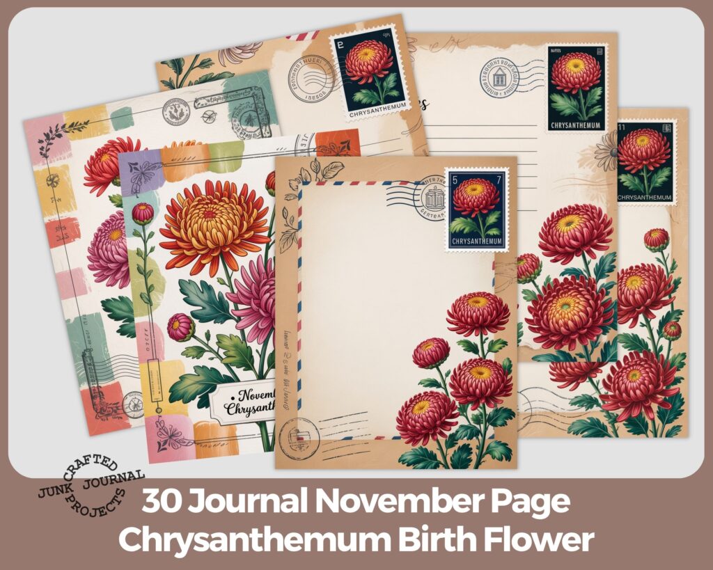 November Chrysanthemum Birth Flower Journal Pages, Menstrual & Daily Notes Printable, Junk Journal Supplies, Vintage Scrapbook Kit