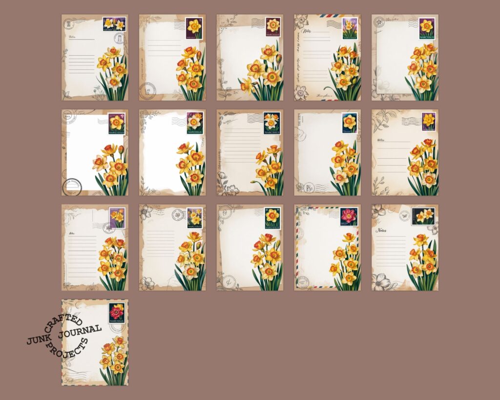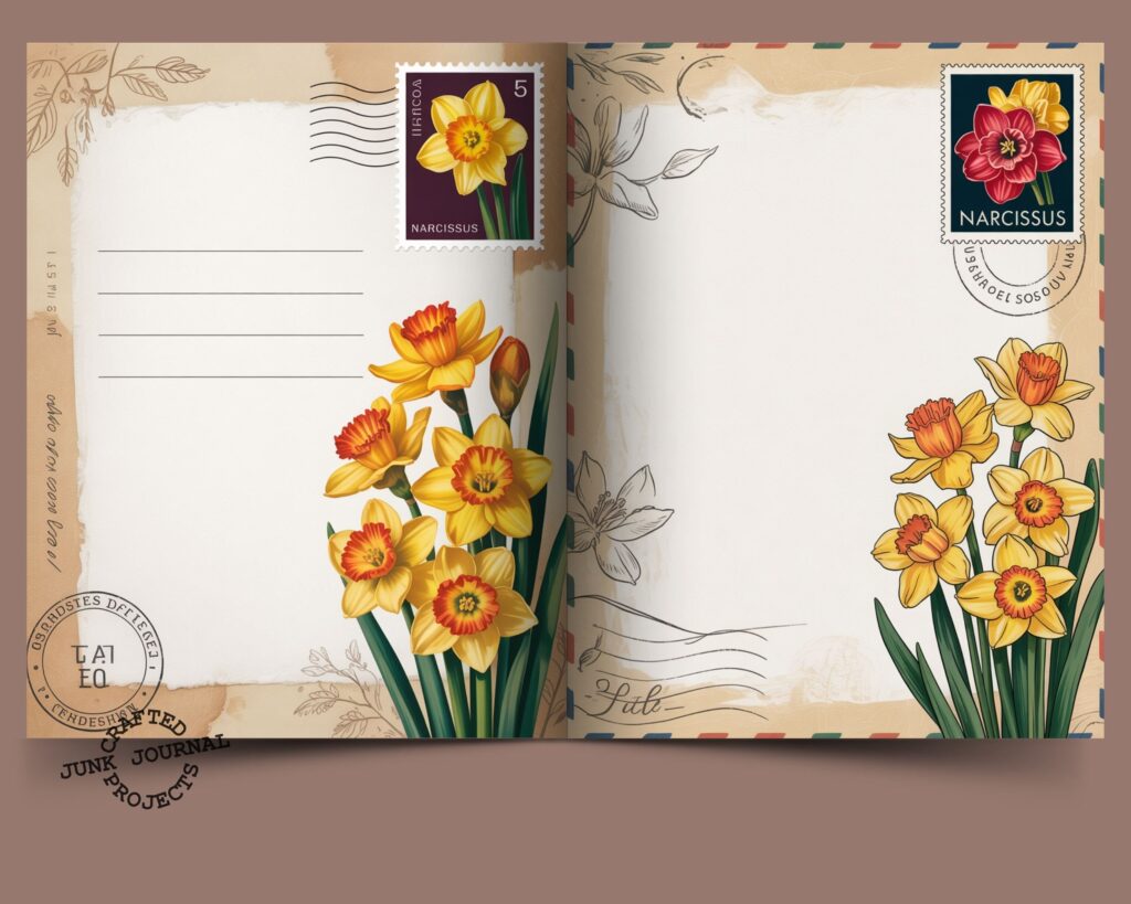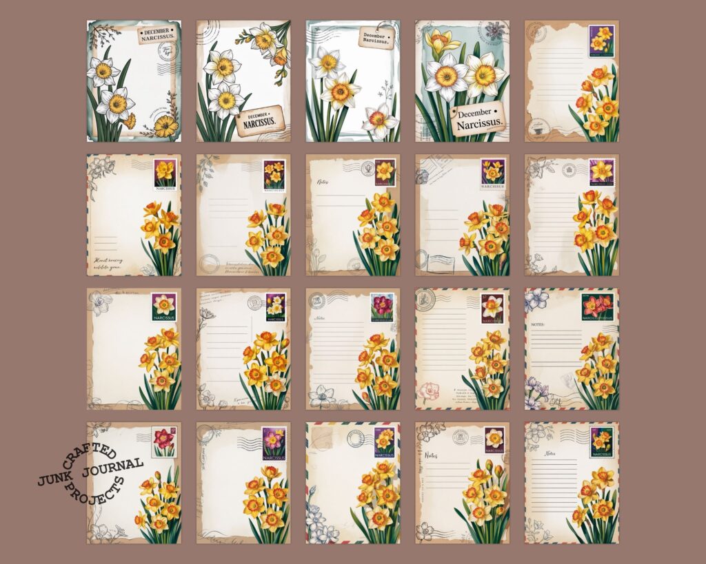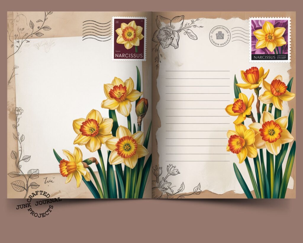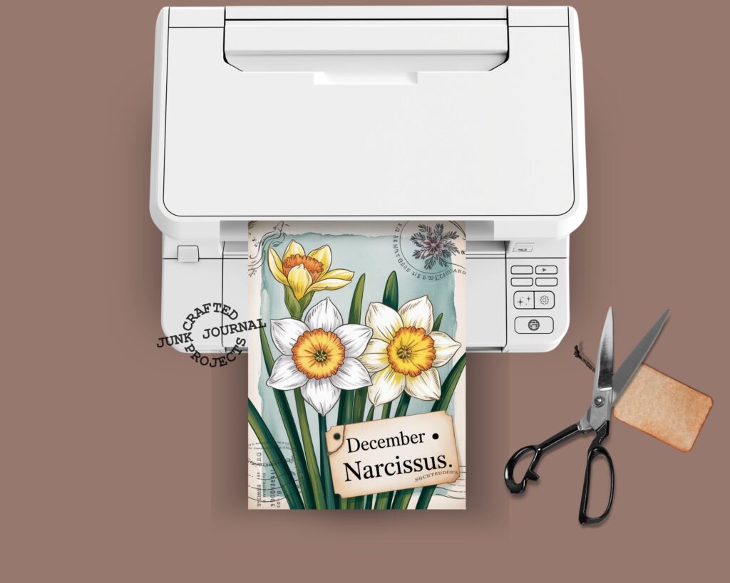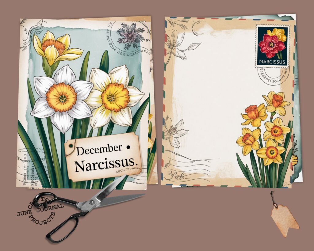 December Birth Flower Journal Page – Narcissus Printable, Vintage Collage Stationery, Tea-Stained Paper, Junk Journal Supplies