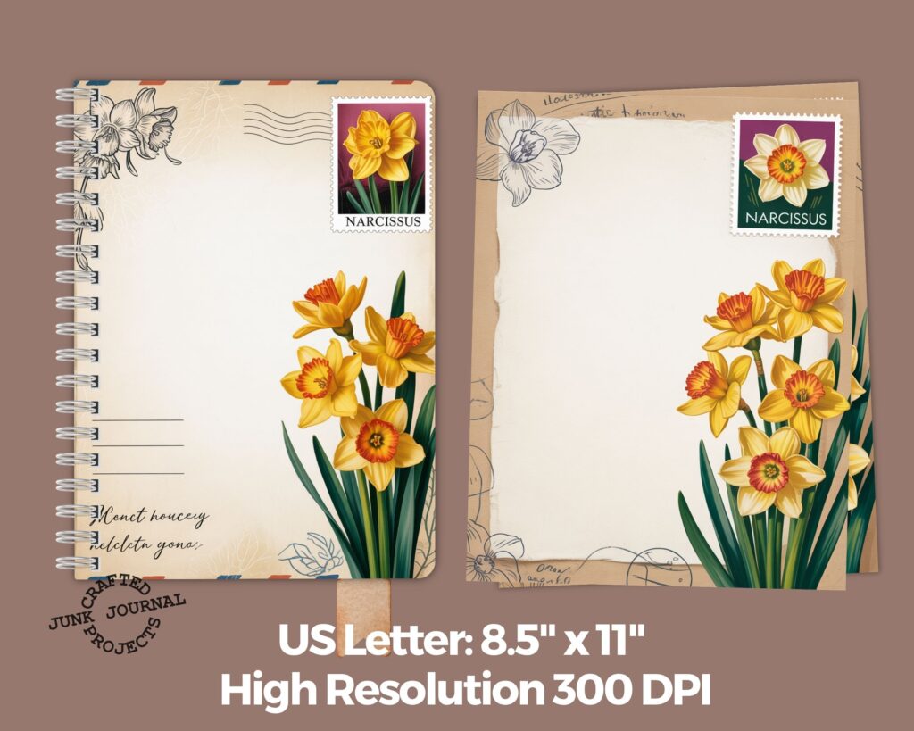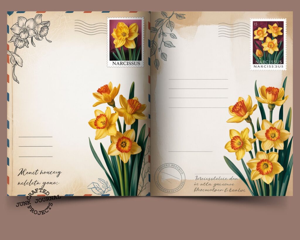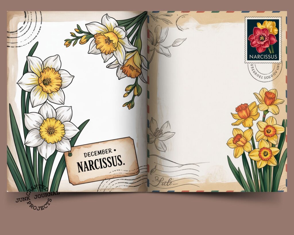 Celebrate the month of December with this elegant Narcissus Birth Flower Journal Page. A richly colored narcissus postage stamp adorns the top right corner, while a full cluster of narcissus blossoms blooms gracefully at the bottom right. The central area provides ample space for journaling or daily reflections, perfectly suited for creative note-taking or scrapbooking.