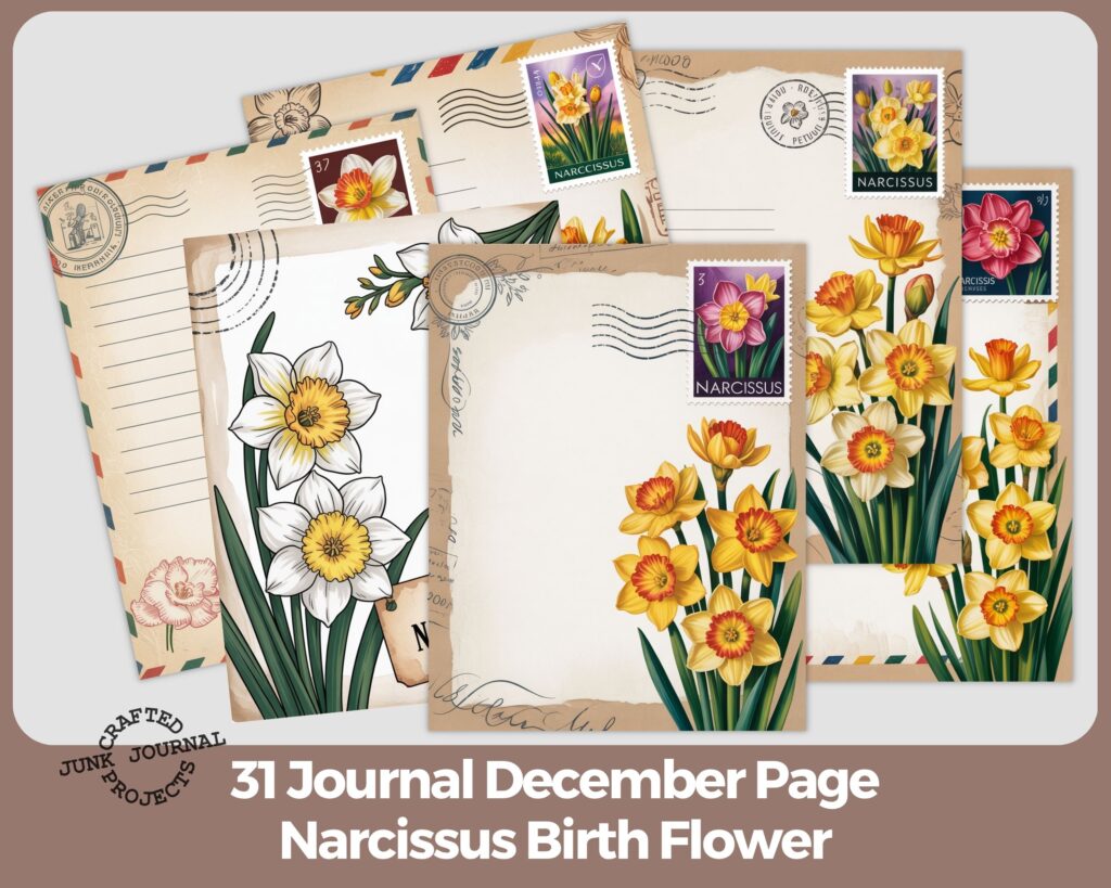 December Birth Flower Journal Page – Narcissus Printable, Vintage Collage Stationery, Tea-Stained Paper, Junk Journal Supplies